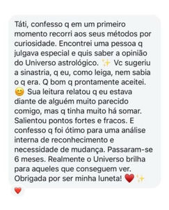 Quando a Astrologia surgiu, tudo se encaixou. Senti que, finalmente, minha vivência e experiência estavam alinhadas. Hoje, posso usar tudo o que vivi para ajudar pessoas a se conectarem consigo mesmas e, assim, atingirem a harmonia familiar e o bem-estar. Acredito no poder do autoconhecimento como ferramenta de transformação e estou aqui para compartilhar isso com você.